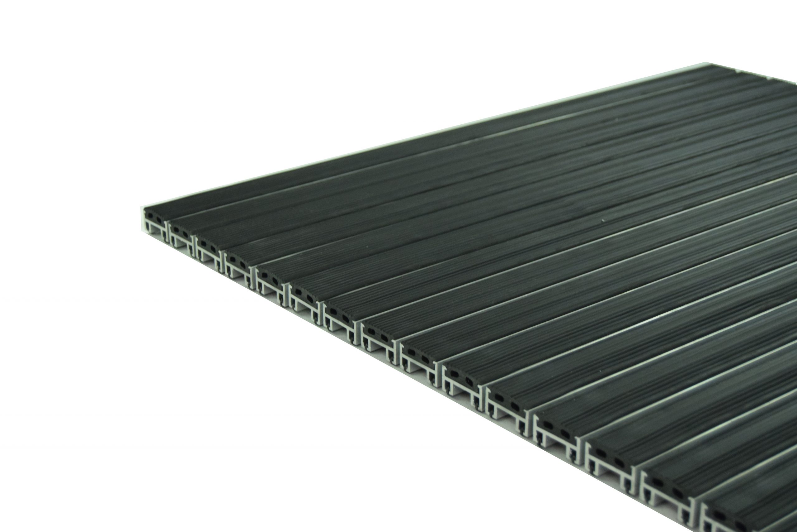 Состоит из резиновых вставок на несущих профилях из алюминия, которые стянуты тросом из нержавеющей стали в группу, образующую единую систему грязезащитной решётки.